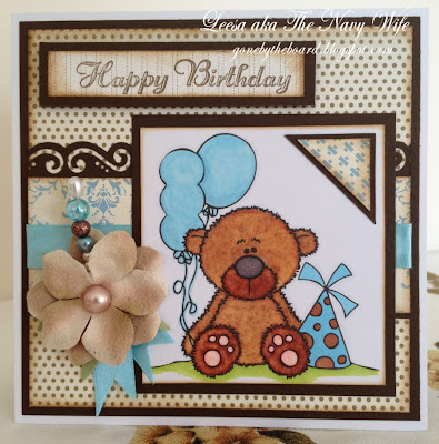 Aww this is So sweet Leesa! I love this Barry image and you've coloured him beautifully! The papers and embellies are gorgeous. Love the colour combo - it's a perfect male card!